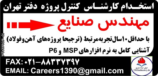 جهت عنوان شغلی کارشناس کنترل پروژه از مهندسین صنایع جهت فعالیت در دفتر تهران دعوت به همکاری می شود.
