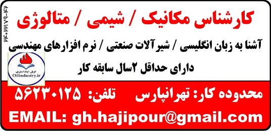 استخدام کارشناس مکانیک - شیمی - متالوژی جهت فعالیت در محدوده تهرانپارس ۱۳۹۸/۰۲/۲۱