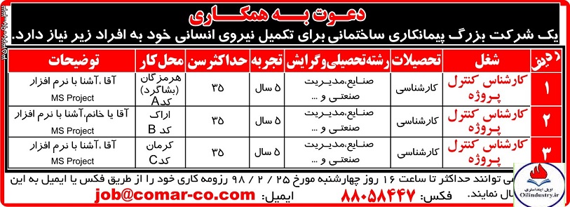 یک شرکت بزرگ پیمانکاری ساختمانی از کارشناسان صنایع - مدیریت صنعتی جهت فعالیت در هرمزگان - اراک - کرمان دعوت به همکاری می نماید.