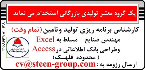 گروه معتبر تولیدی و بازرگانی جهت عنوان شغلی کارشناس برنامه ریزی تولید و تامین از مهندسین صنایع در گروه معتبر تولیدی بازرگانی (محدوده قلهک دعوت به همکاری می نماید.