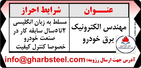استخدام مهندس الکترونیک برق خودرو ( مسلط به زبان انگلیسی ) ۱۳۹۸/۰۲/۲۱