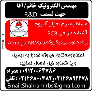 از مهندسین الکترونیک خانم/ اقا جهت فعالیت در واحد R & D دعوت به همکاری می شود.