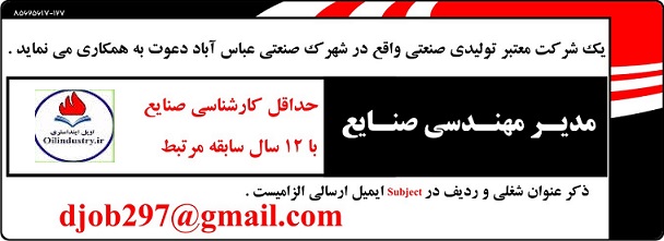 یک شرکت معتبر تولیدی واقع در شهرک صنعتی عباس اباد از مهندسین صنایع دعوت به همکاری می نماید.