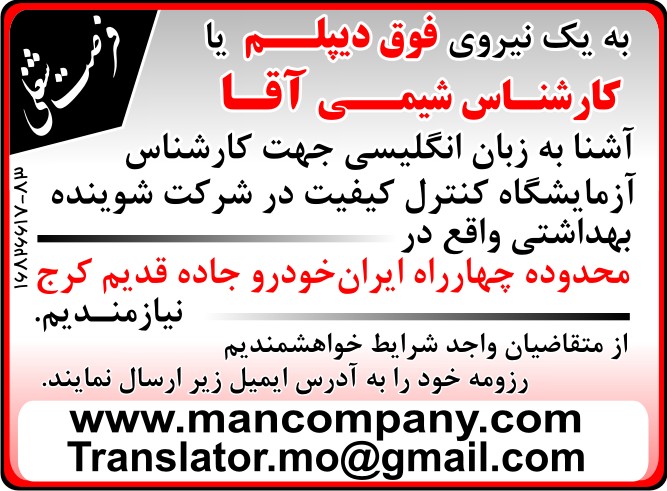 یک شرکت واقع در جاده قدیم کرج از کارشناسان / فوق دیپلم شیمی (آقا) دعوت به همکاری می نماید.