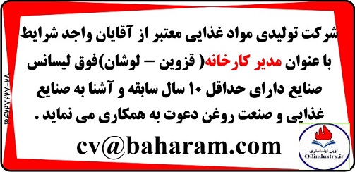 یک شرکت تولیدی مواد غذایی از کارشناسان ارشد صنایع جهت فعالیت در عنوان شغلی مدیر کارخانه دعوت به همکاری می نماید.