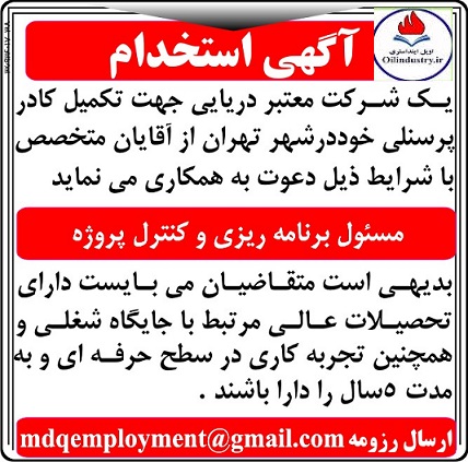 یک شرکت معتبر دریایی جهت سمت مسئول برنامه ریزی و کنترل پروژه از واجدین شرایط دعوت به همکاری می نماید.