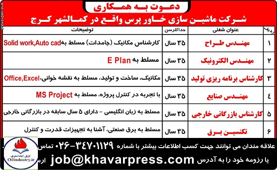 شرکت ماشین سازی خاور پرس واقع در کمالشهر کرج از مهندسین الکترونیک, صنایع و کارشناس مکانیک و تکنسین برق دعوت به همکاری می نماید.