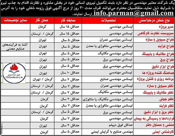 یک شرکت مهندسی در 17 رده شغلی از کارشناسان مهندسی عمران - مکانیک - صنایع - برق - متالوژی - معدن جهت فعالیت در کرمان و تهران دعوت به همکاری می نماید.