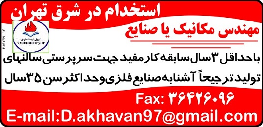 استخدام مهندس صنایع - مکانیک جهت فعالیت در شرق تهران ۱۳۹۸/۰۳/۱۱