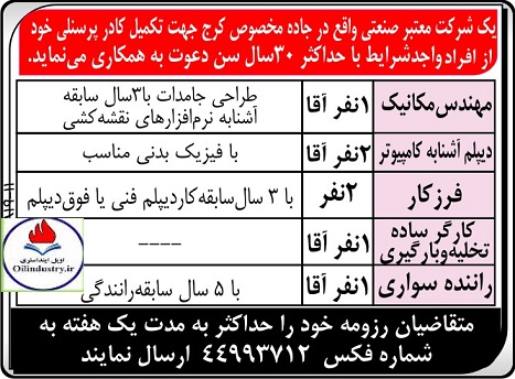استخدام 7 نفر با مدرک کاردان و دیپلم و مهندس مکانیک و ... در شرکت معتبر صنعتی واقع در جاده مخصوص کرج ۱۳۹۸/۰۳/۱۱