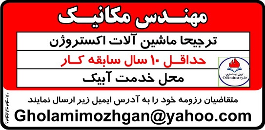 از مهندس مکانیک جهت فعالیت در محل خدمت آبیک دعوت به همکاری می شود.