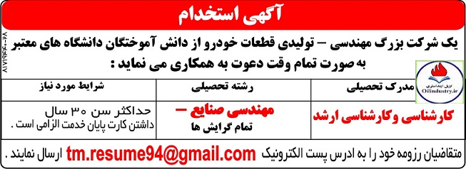 یک شرکت بزرگ مهندسی - تولیدی از کارشناسان/ کارشناسان ارشد مهندسی صنایع دعوت به همکاری می نماید.
