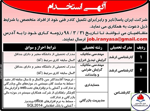 شرکت ایران یاسا از کارشناسان/کارشناسان ارشد مهندسی مکانیک (گرایش تبدیل انرژی - طراحی و جامدات) و کارشناس حسابداری و مدیریت بازرگانی دعوت به همکاری می نماید.