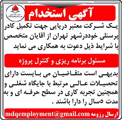 یک شرکت دریایی جهت عنوان شغلی مسئول برنامه ریزی و کنترل پروژه جهت فعالیت در دفتر تهران دعوت به همکاری می شود.