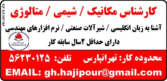 از کارشناسان مکانیک - شیمی - متالوژی جهت فعالیت در تهران محدوده تهرانپارس دعوت به همکاری می شود.