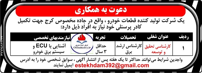 یک شرکت تولید کننده قطعات خودرو واقع در جاده مخصوص کرج از کارشناسان ارشد برق دعوت به همکاری می شود.