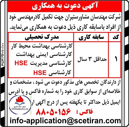 شرکت مهندسان مشاور ستیران از کارشناسان بهداشت - HSE - کارشناس مدیریت HSE دعوت به همکاری می نماید.