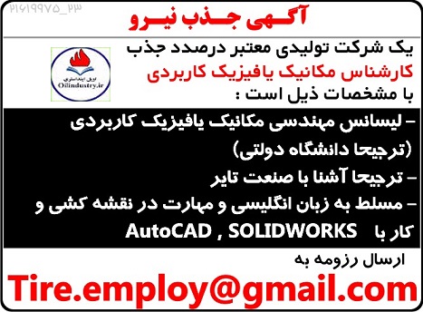 یک شرکت تولیدی از کارشناسان مهندسی مکانیک - فیزیک کاربردی دعوت به همکاری می نماید.