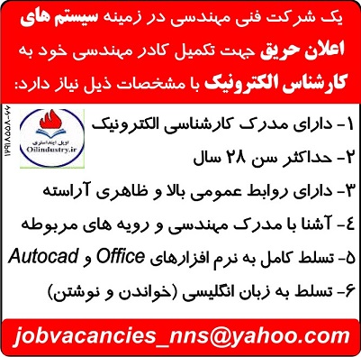استخدام کارشناس الکترونیک در یک شرکت فنی و مهندسی در زمینه سیستم های اعلان حریق ۱۳۹۸/۰۳/۲۹