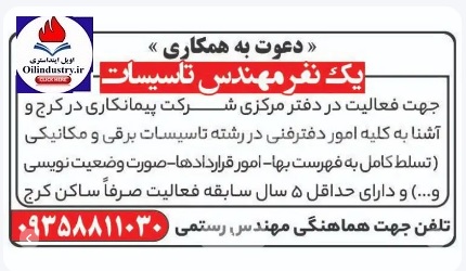 یک شرکت پیمانکاری در کرج از یک نفر مهندس تاسیسات جهت فعالیت در دفتر مرکزی و آشنا به کلیه امور دفترفنی در رشته تاسیسات برقی و مکانیکی ( تسلط کامل به فهرست بها- امور قراردادها-صورت وضعیت نویسی و...) و دارای حداقل 5 سال سابقه فعالیت دعوت به همکاری می نماید.