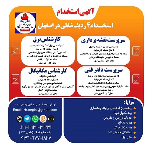 یک شرکت معتبر فنی و مهندسی واقع در اصفهان با 20 سال سابقه فعالیت در زمینه اجرای پروژه های ساختمانی دارنده رتبه های ممتاز کشوری ، سازنده بیش از 10000واحد آپارتمان مسکونی، بیمارستان و ایستگاههای مترو جهت عنوان های شغلی سرپرست نقشه برداری - کارشناس برق و مکانیکال و سرپرست دفتر فنی از واجدین شرایط دعوت به همکاری می شود.