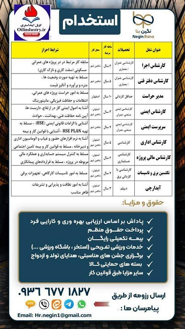 جهت عنوان های شغلی کارشناس فنی - دفتر اجرا - مدیر حراست - سرپرست ایمنی - کارشناس اداری - کارشناس مالی پروژه - تکنسین برق و تاسیسات از واجدین شرایط دعوت به همکاری می نماید.