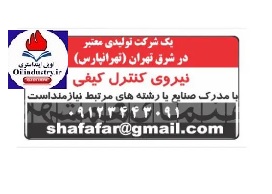 یک شرکت تولیدی معتبر در شرق تهران (تهرانپارس) از کارشناسان صنایع یا رشته های مرتبط جهت فعالیت در عنوان شغلی کنترل کیفی دعوت به همکاری می نماید.