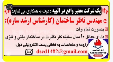 استخدام مهندس ناظر ساختمان ( کارشناس ارشد سازه ) جهت فعالیت بصورت تمام وقت در یک شرکت معتبر واقع در الهیه ۱۴۰۲/۱۰/۲۶