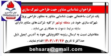 یک شرکت ساختمانی جهت شناسایی مشاور از مهندسین واجد شرایط جهت طراحی پروژه های شهرک سازی خود در منطقه نوشهر از کلیه شرکت های مشاور دارای سابقه مرتبط دعوت به همکاری می نماید .متقاضیان نسبت به ارسال رزومه الکترونیکی خود به ادرس ایمیل ذیل حداکثر تا تاریخ 1403/03/26 اقدام نمایند .