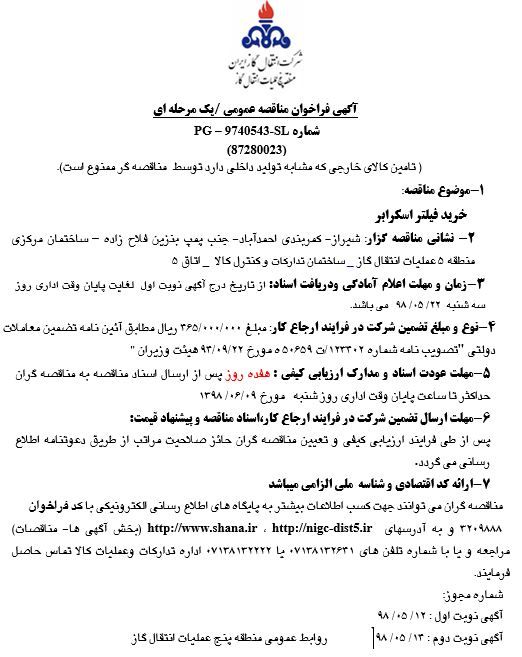 | عنوان مناقصه | آگهی فراخوان مناقصه عمومی /یک مرحله ای شماره PG – 9740543-SL -خرید فیلتر اسکرابر (87280023) |