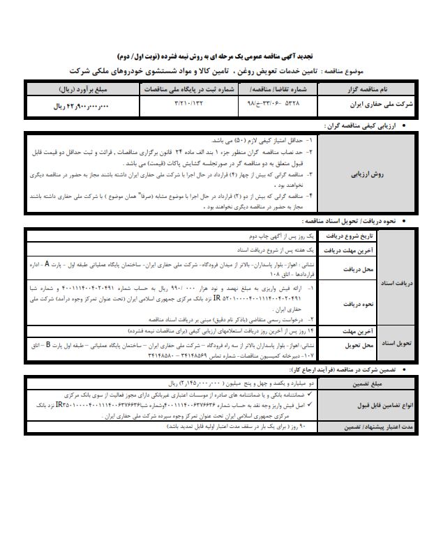 | شماره مناقصه | ۹۸-۴۳۲۸ |