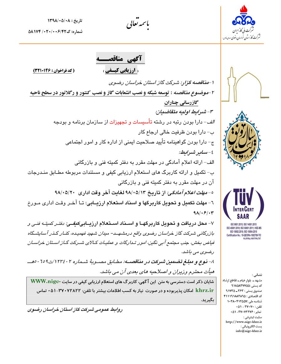 | مناقصه گزار | شرکت گاز استان خراسان رضوی |
