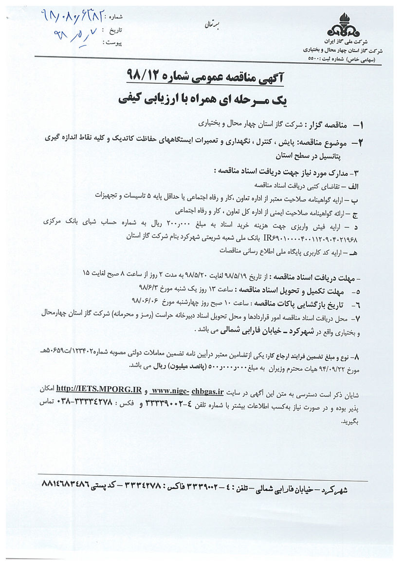 | عنوان مناقصه | پایش ،کنترل ،نگهداری و تعمیرات ایستگاههای حفاظت کاتدیک و کلیه نقاط اندازه گیری پتانسیل در سطح استان (مناقصه عمومی ) |