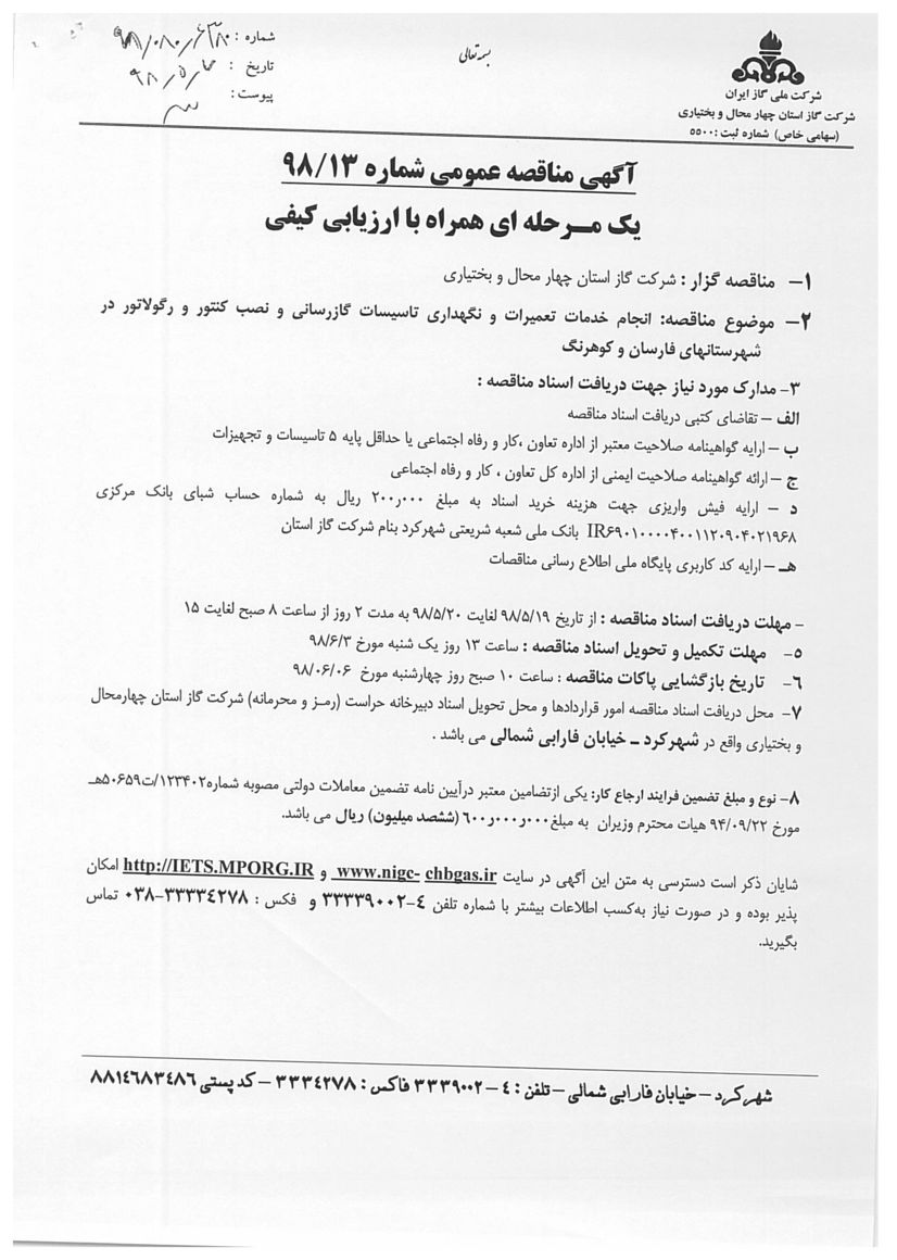 | عنوان مناقصه | انجام خدمات تعمیرات و نگهداری تاسیسات گازرسانی و نصب کنتورو رگولاتور در شهرستانهای فارسان و کوهرنگ (مناقصه عمومی ) |