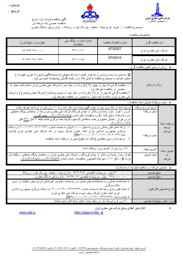 | شرح مناقصه | اطلاعات بیشتر در آگهی مناقصه پیوست. |