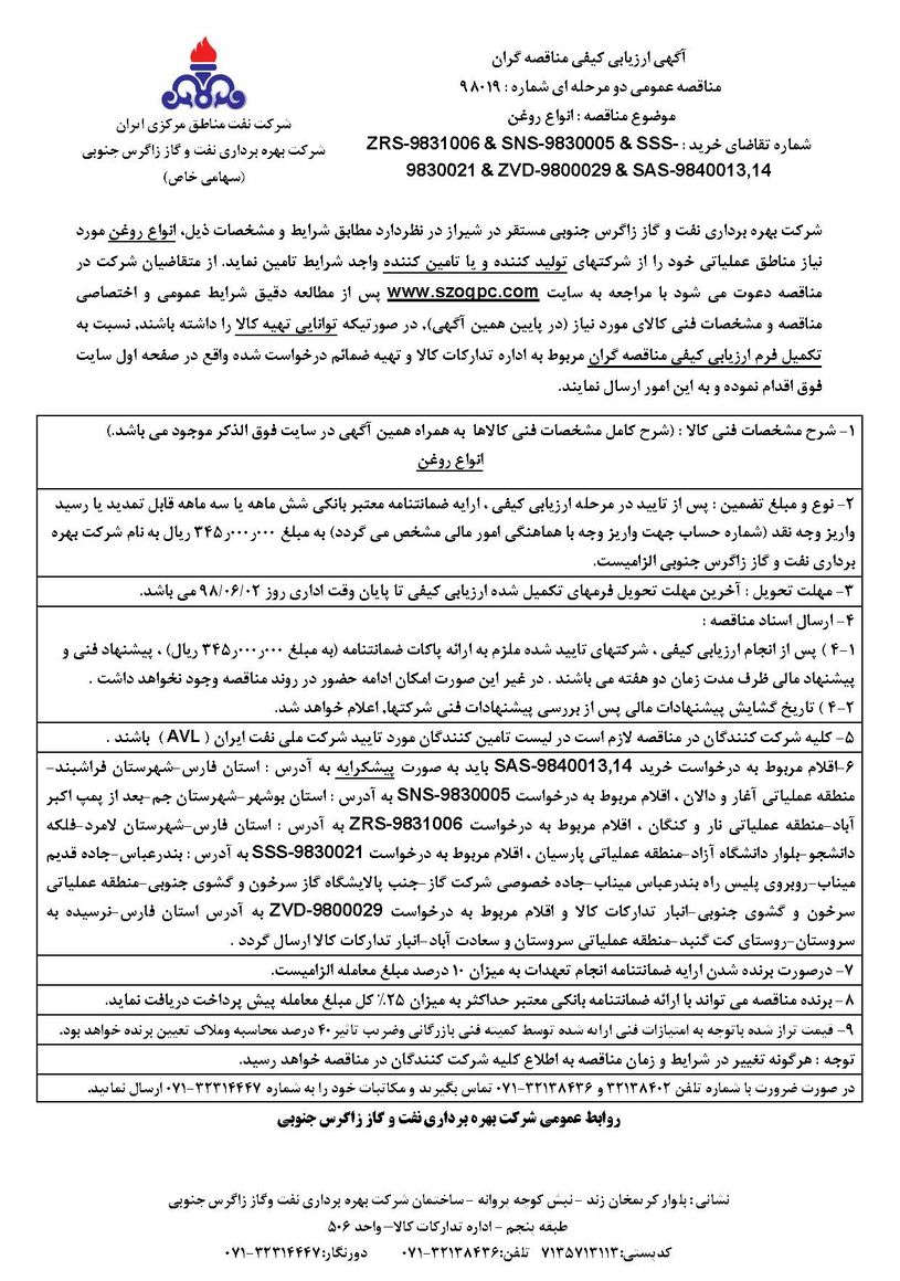 | مناقصه گزار | شرکت بهره برداری نفت وگاز زاگرس جنوبی |