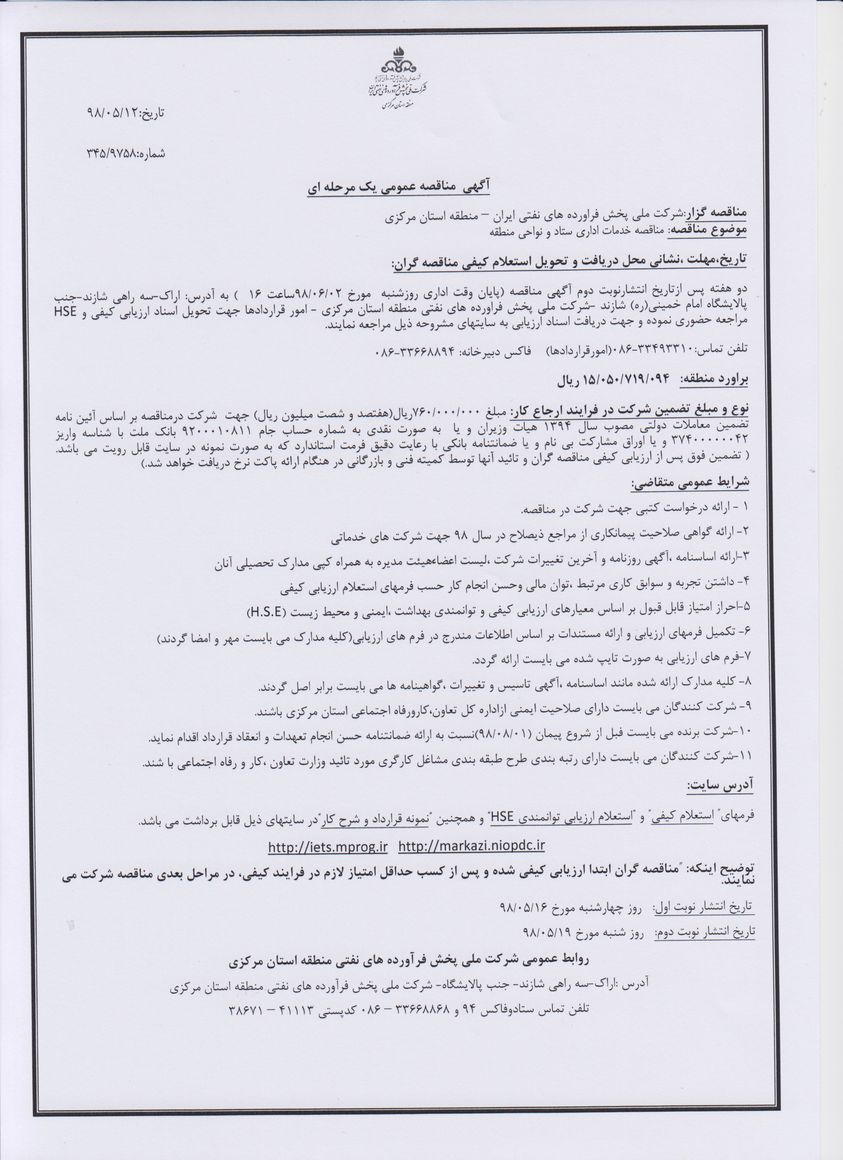 | عنوان مناقصه | مناقصه خدمات اداری ستادو نواحی منطقه |