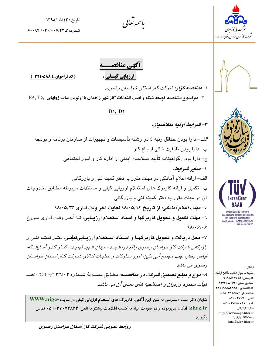 | مناقصه گزار | شرکت گاز استان خراسان رضوی |