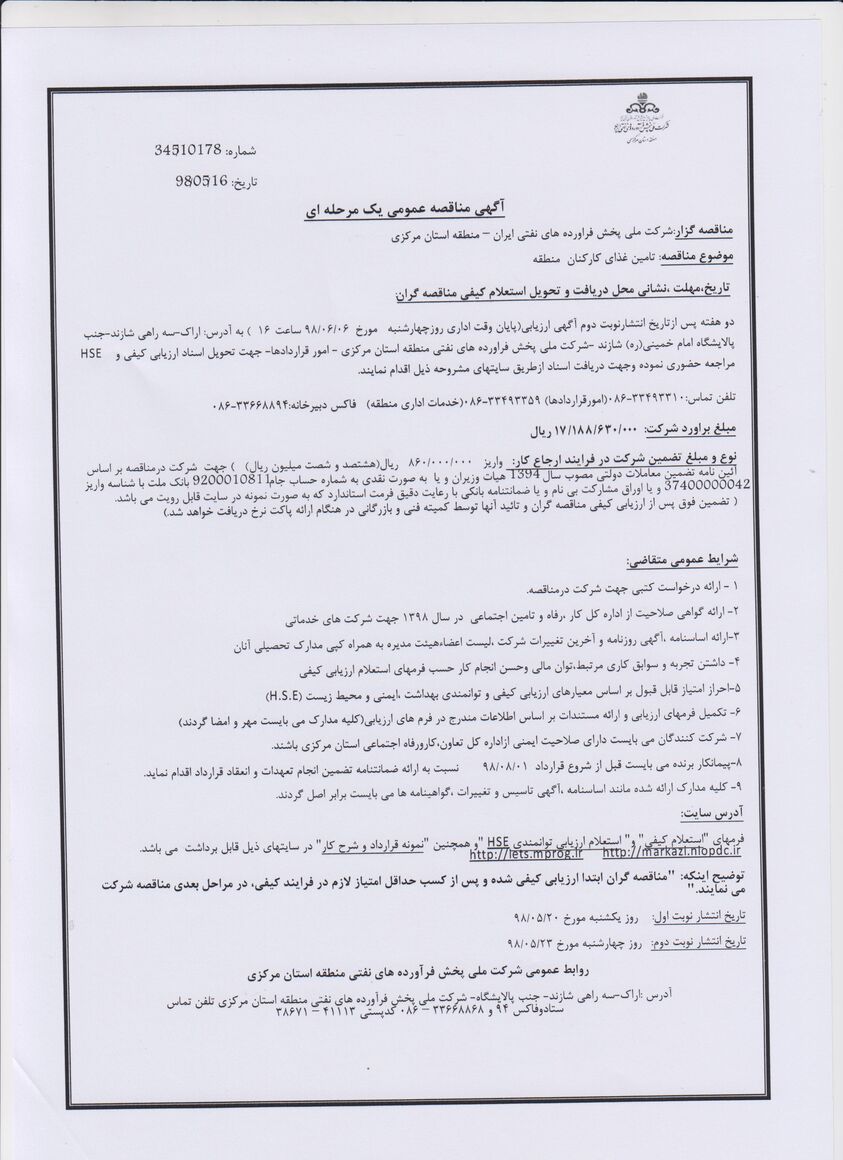 | عنوان مناقصه | تامین غذای کارکنان منطقه |