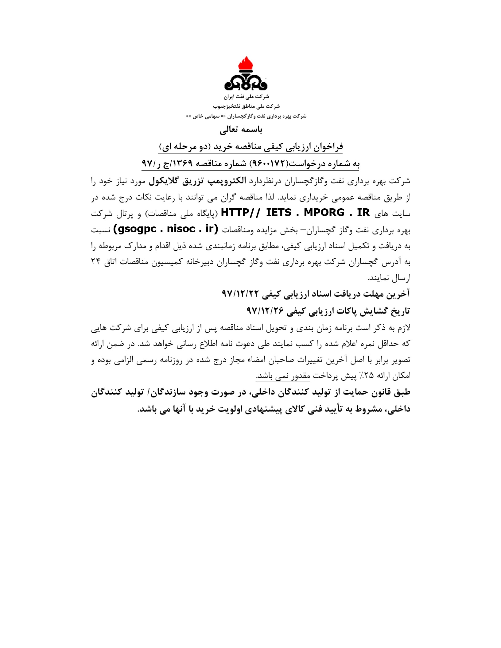 | مناقصه گزار | شرکت بهره برداری نفت وگاز گچساران |